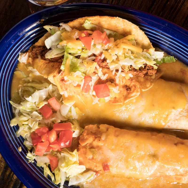 Chicken, ground beef, shredded beef, bean, or carnitas. Topped with melted cheese and smothered in green chili.